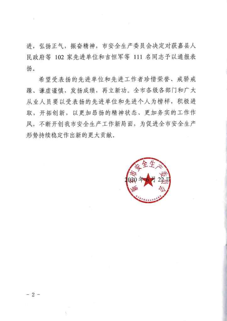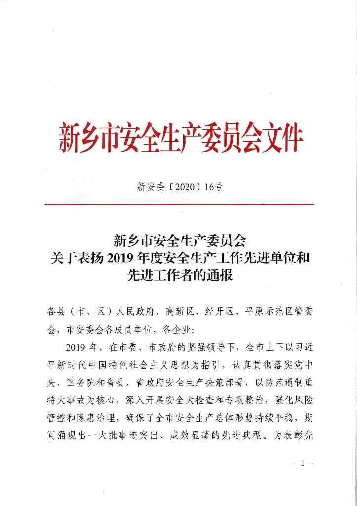 (發(fā)布時(shí)間:2020-07-20 點(diǎn)擊:4265)日前,從新鄉(xiāng)市安全生產(chǎn)委員會(huì)傳來消息,我公司被新鄉(xiāng)市安全生產(chǎn)委員會(huì)評(píng)為“2019年度安全生產(chǎn)工作先進(jìn)單位”。這一榮譽(yù)稱號(hào)的獲得,是對(duì)我公司安全生產(chǎn)工作的高度認(rèn)同和表揚(yáng)。