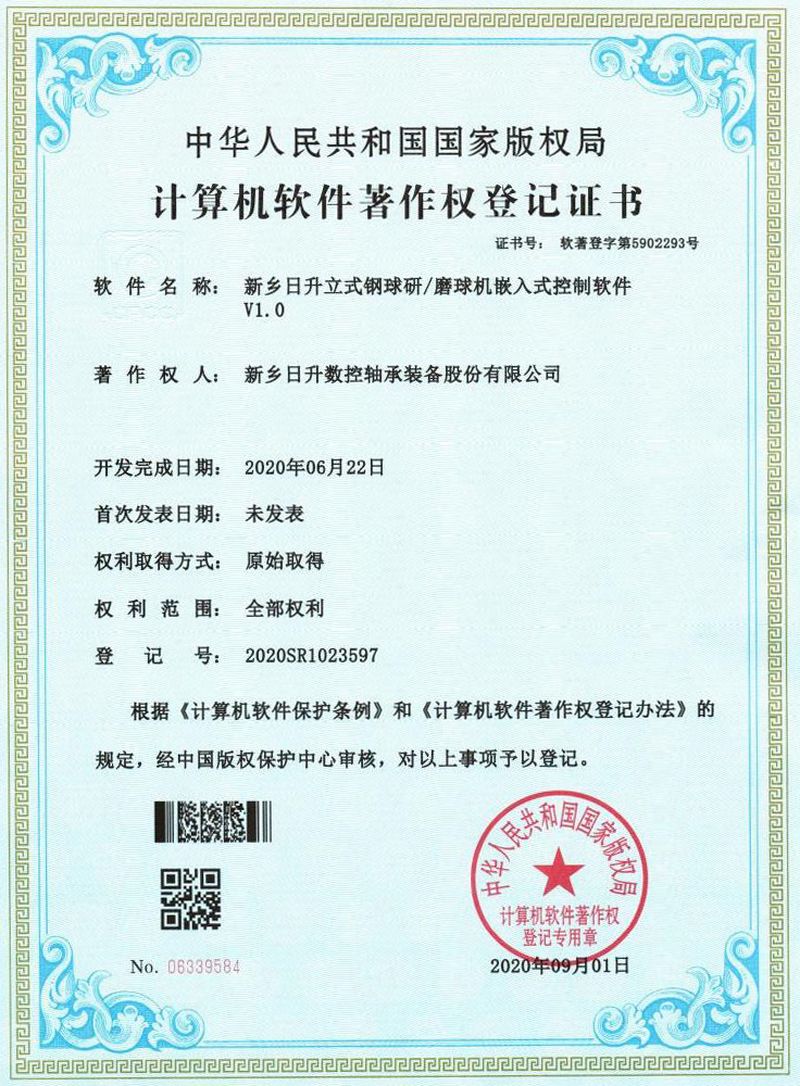 近日,我公司 “新鄉(xiāng)日升立式鋼球研/磨球機嵌入式控制軟件 V1.0” 獲得國家版權(quán)局“計算機軟件著作權(quán)”登記。 該項軟件主要功能有手動操作,自動工藝參數(shù)設(shè)定加工,工作壓力自動調(diào)整,報警顯示,設(shè)備點檢等功能。軟件功能完善,性能穩(wěn)定,易于操作,自動化程度高,人機工程好,應(yīng)用廣泛。 該軟件著作權(quán)的登記,可以對上述機床的控制程序進行充分保護,也將為保持公司在鋼球裝備行業(yè)的領(lǐng)先地位起到積極的作用,從而提高鋼球加工裝備行業(yè)整體自動化和智能化程度。