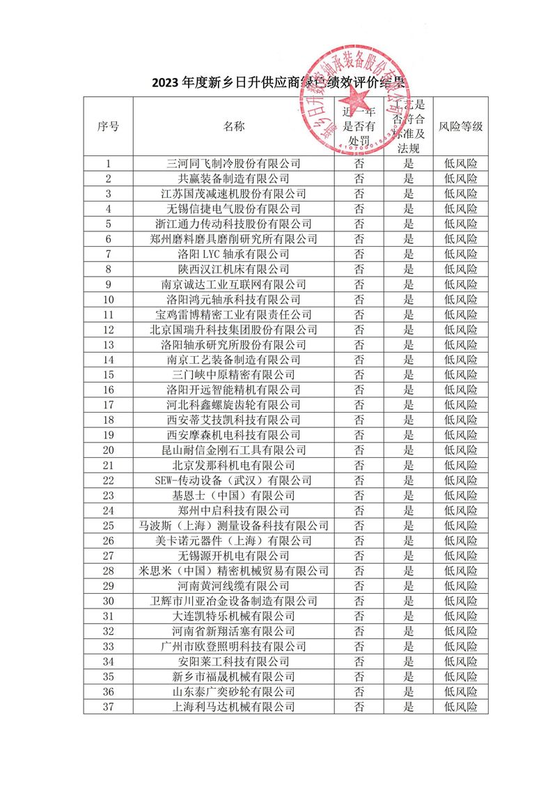 新鄉(xiāng)日升-低風險供應商公示-2023年度新鄉(xiāng)日升供應商綠色績效評價結果